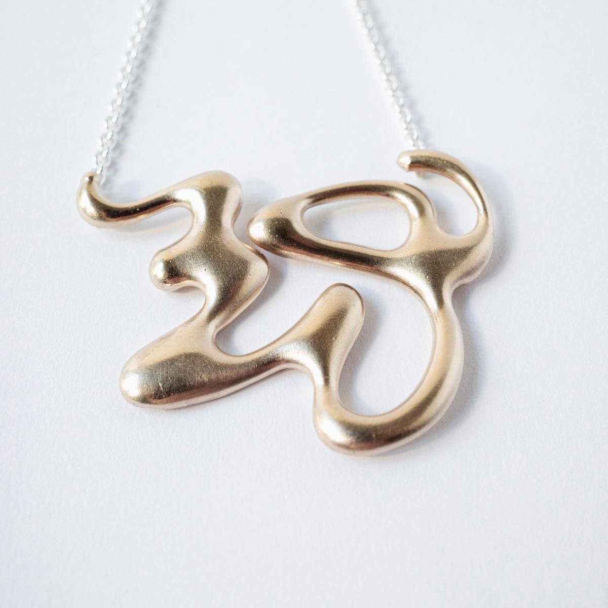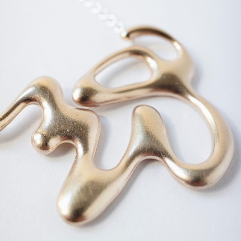 A beautiful ‘Flow’ pendant made in 9ct yellow gold which hangs on a silver trace chain; the organic unique shape is created by melting wax and then working in partnership with its temperature and viscosity to determine the forms created. The waxes are then cast in precious metal, polished and finished.