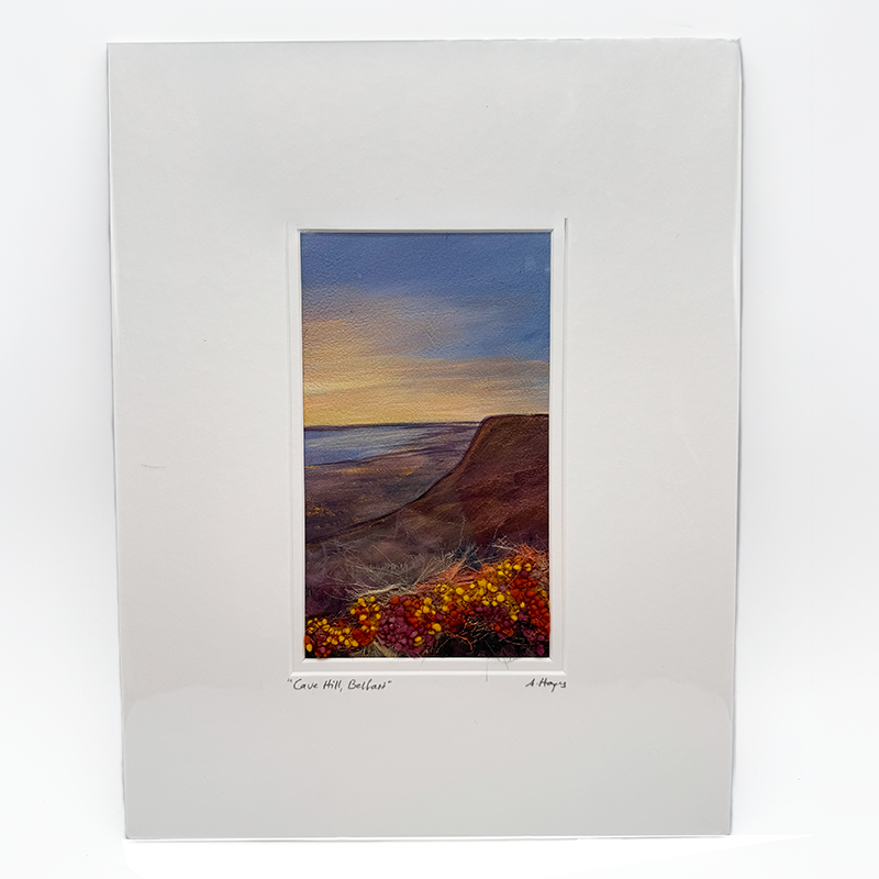 Cave Hill, Belfast Mounted Picture, unframed embroidered textile piece in white, square mount. Handmade by Andrea Hayes in Co. Tyrone, Northern Ireland.