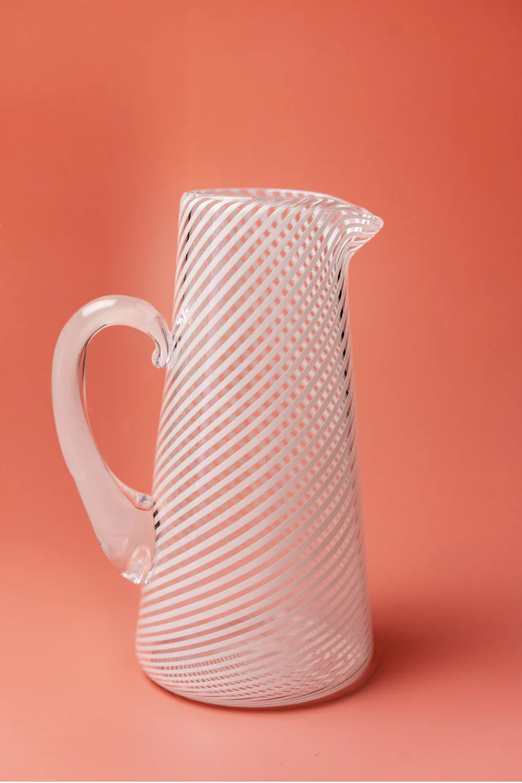 This style of jug is made with fine white canes, the piece is complimented with a clear glass handle.