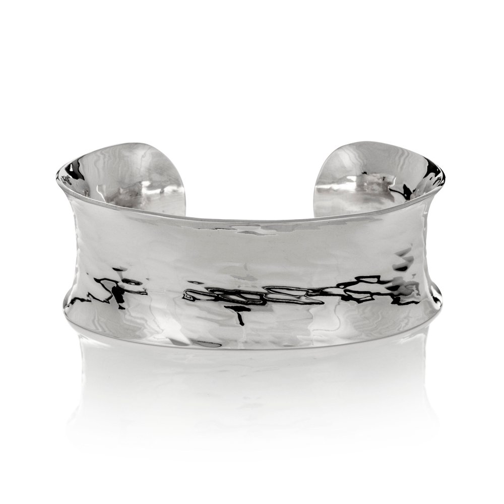 He exploits the working qualities of silver or bronze, stretching and compressing the metal to move it into elegant three dimensional forms. Working in harmony with the natural movement of the metal leads to his work being compared to natural forms.