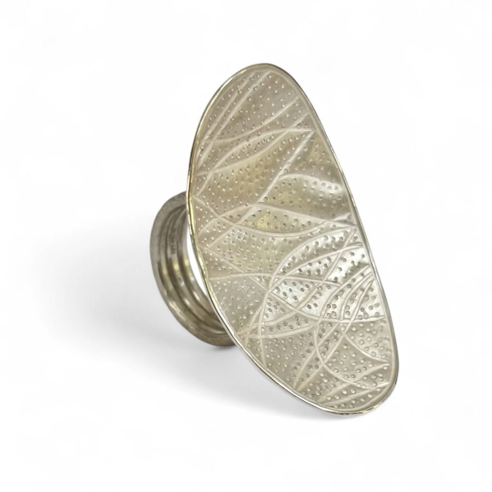 Beautiful oval tangle ring makes a real statement. Hand chased lines criss cross the surface, interspersed with rounded punch marks, reminiscent of seaweed strewn sandy beaches. The ring has a hammered rounded chunky triple band for comfort and a smooth polished edge to catch the light. The chased oval sits across the fingers.