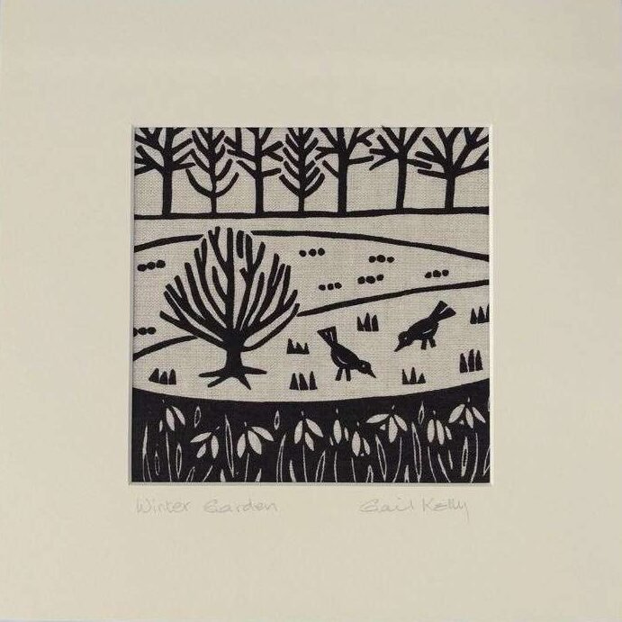“Winter Garden” linocut on Irish linen by Gail Kelly